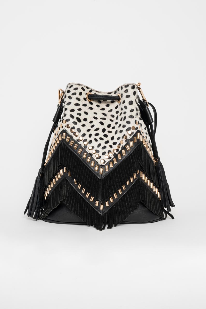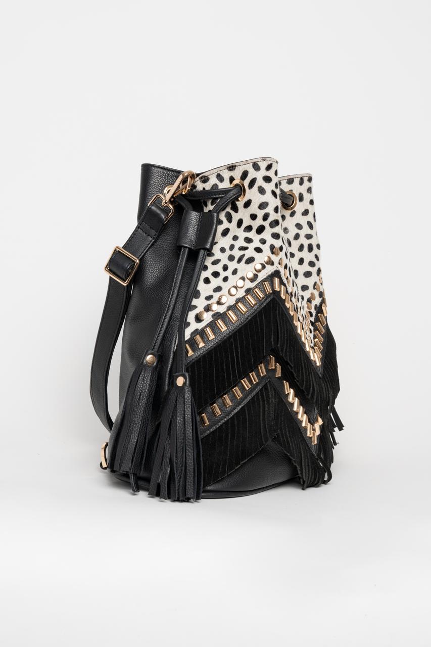 Dalmatian pattern backpack that transfers to bucket bag